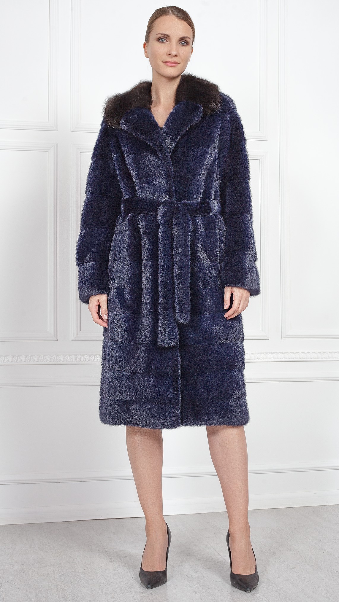 Шуба из меха норки, отделка куница