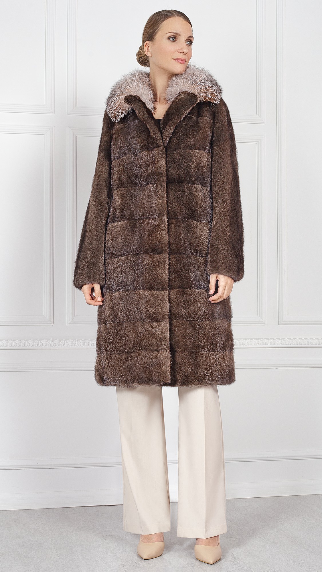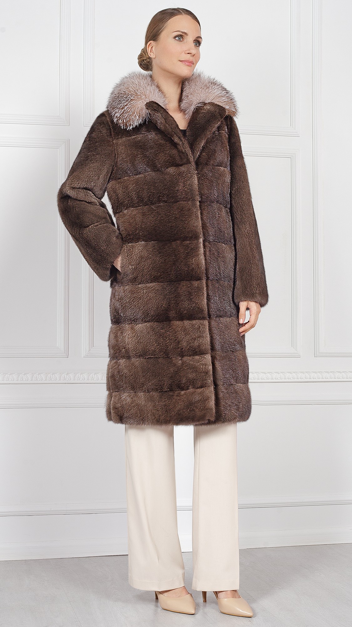 Шуба из меха норки, отделка лиса